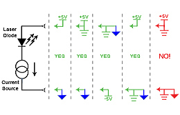 In some medical systems, the laser diode anode must be grounded. In other cases, the cathode must be grounded. There are some systems where the laser diode power supply must be floated so the optical table can be wired to ground to reduce system noise. Adding computer control also complicates grounding. Our Application Note AN-LD16: Grounding with Special Laser Diode Configurations discusses these situations and offers guidance for implementing them.
