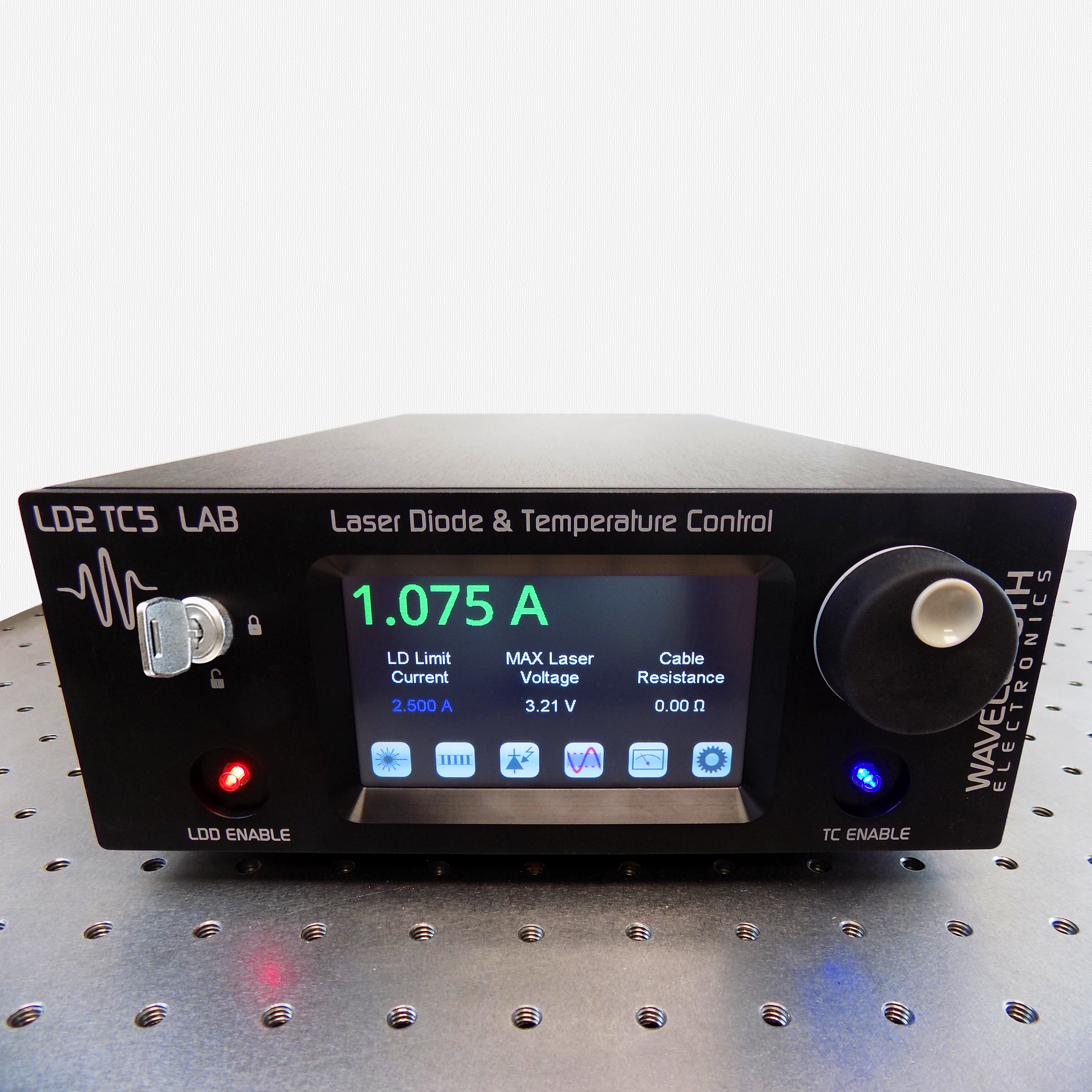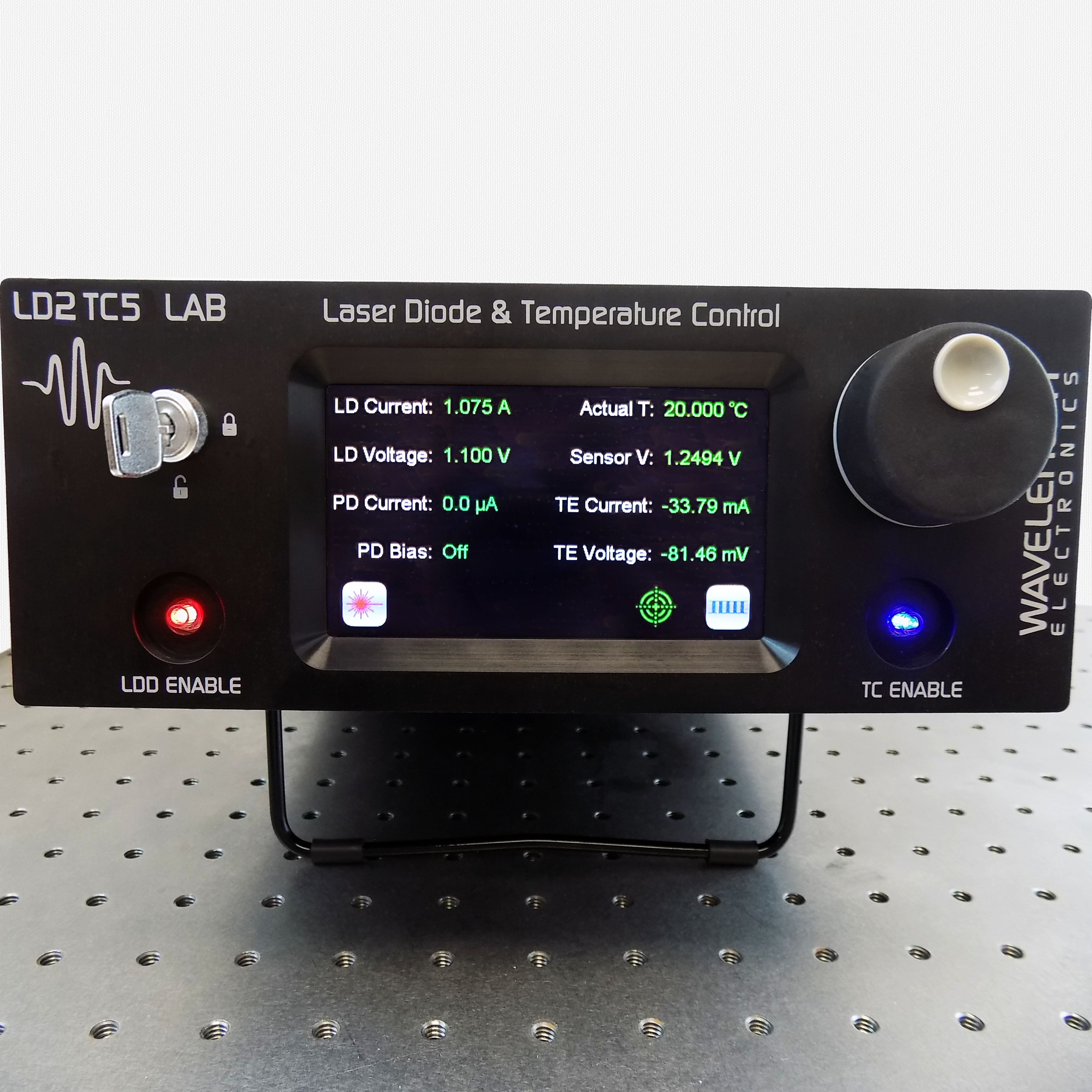 Two models are available, the LD2TC5 LAB and the LD5TC10 LAB. The LD2TC5 LAB outputs up to 2 and 5 A for the laser and thermoelectric, respectively. The LD5TC10 LAB outputs up to 5 and 10 A. Both models offer 10 V of laser compliance voltage and 15 V of thermoelectric compliance voltage.