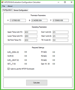 Download the Configuration Calculator for the WTCP5V5A Evaluation Board. This easy-to-use component selection calculator simplifies system design and configuration. Simply enter your sensor parameters and the operating conditions for your application and the calculator will determine the Evaluation Board settings to achieve optimal performance.